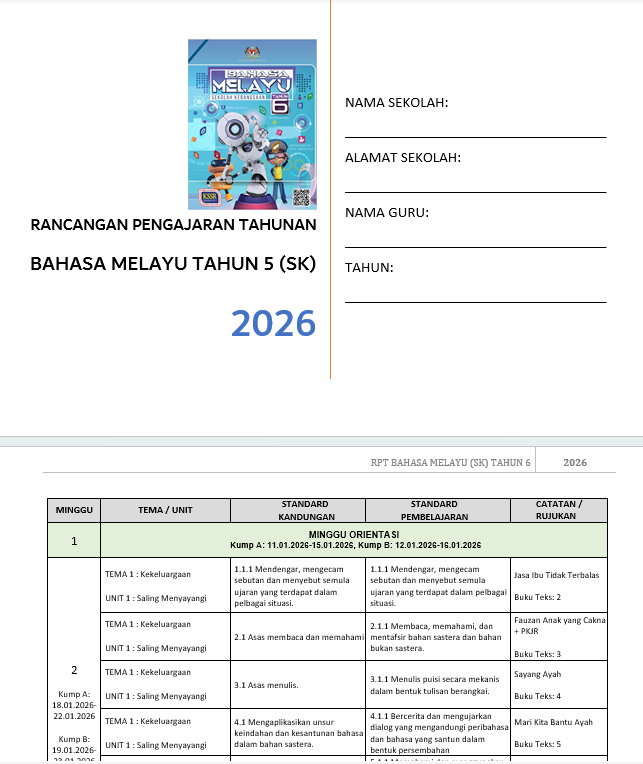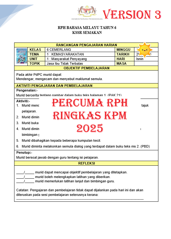 RPH LENGKAP SETAHUN kini tersedia untuk guru sekolah rendah! Dapatkan segera RPH terkini dan lengkap dengan semua bahan tambahan PERCUMA yang memudahkan PdP harian. Dalam satu set, anda akan menerima DSKP & RPT 2025/2026 (lengkap tarikh Kumpulan A & B), muka depan, Borang Transit 3 versi (Excel Autosum, Excel Manual & Senarai Semak Word), serta Panduan Tahap Pencapaian. Turut disertakan RPH Pendidikan Sivik* (BM, BI, Sejarah, P. Moral, P. Islam) dan RPH PKJR* (bergabung BM). Bonus lain termasuk buku teks PDF, poster cuti am & penggal, divider mingguan, Teacher Planner 2 versi, dan Fail Rekod Penghantaran (Google Drive).