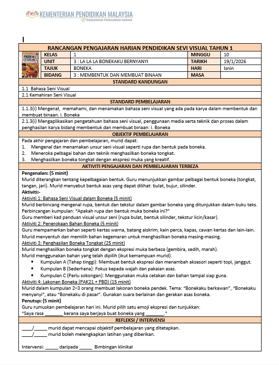 RPH LENGKAP SETAHUN khas untuk guru Pendidikan Seni Visual Tahun 1 Sekolah Rendah kini boleh dimiliki! RPH ini disusun lengkap mengikut DSKP terkini, mudah digunakan dan menjimatkan masa guru. Beli 1 SET RPH dan anda akan menerima pelbagai bahan tambahan PERCUMA yang boleh terus digunakan dalam PdP sepanjang tahun.