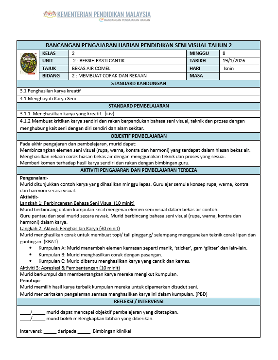 - Sila download dalam masa sebulan selepas pembelian. (RPH Pendidikan Seni Visual Tahun 2 Sekolah Rendah)
