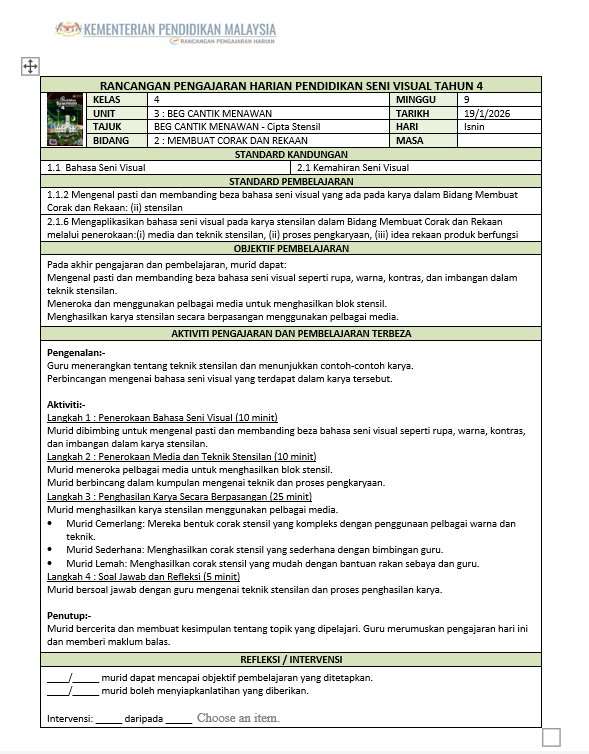 RPH Pendidikan Seni Visual Tahun 4 Sekolah Rendah