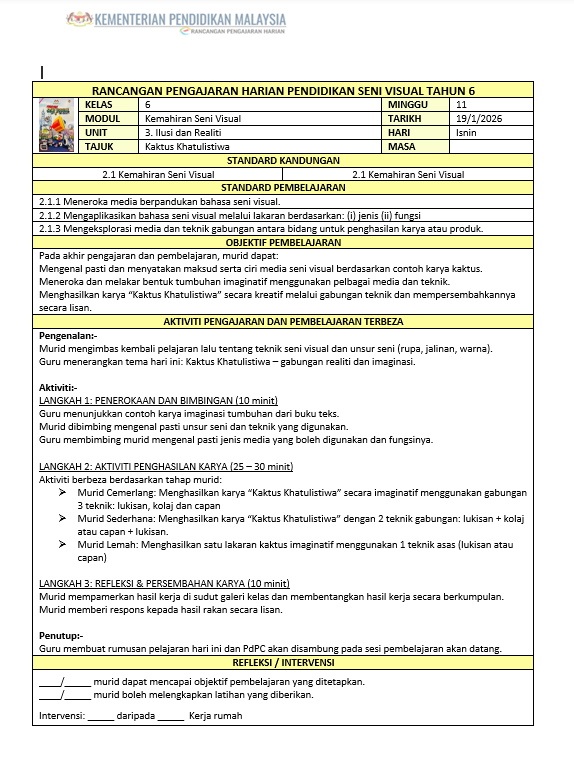 Rancangan Pengajaran Harian Pendidikan Seni Visual Tahun 6 Sekolah Rendah