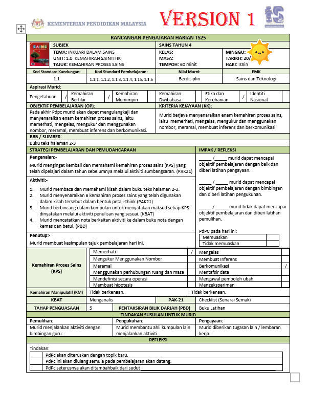 Rancangan Pengajaran Harian Sains Tahun 4 Sekolah Rendah