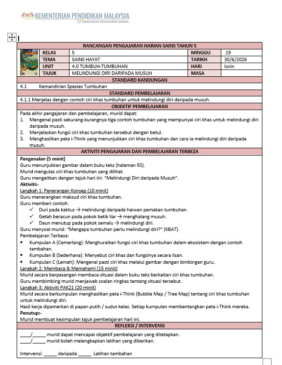 Rancangan Pengajaran Harian Sains Tahun 5 Sekolah Rendah