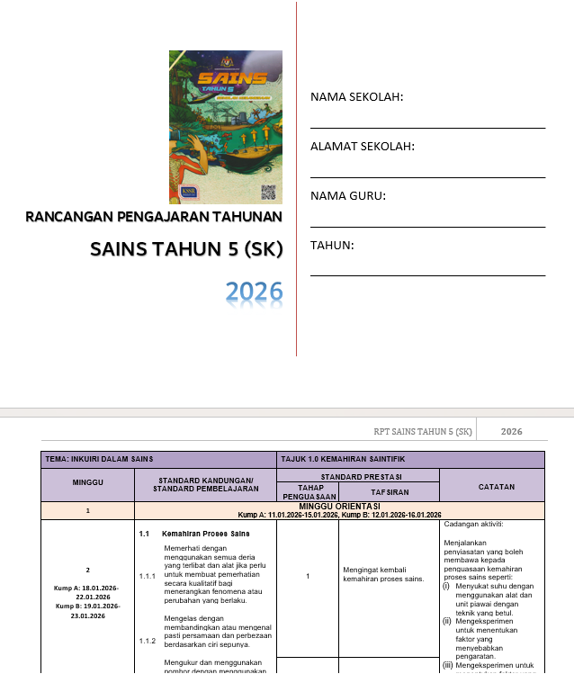 RPH lengkap setahun bagi mata pelajaran Sains Tahun 5 disediakan untuk membantu guru merancang pengajaran mengikut kurikulum semasa. Kandungan utamanya merangkumi DSKP dan RPT 2025/2026 yang telah disusun mengikut tarikh bagi Kumpulan A dan B. Bersama dengan itu, terdapat borang transit dan panduan tahap pencapaian (TP) untuk memudahkan pentaksiran murid. Versi borang transit boleh hadir dalam bentuk Excel (automatik dan manual) atau senarai semak dalam Word.