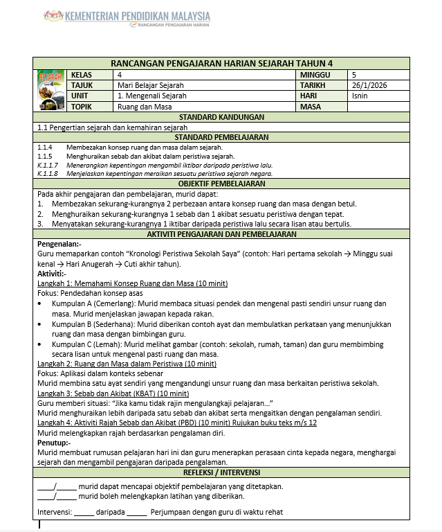 Rancangan Pengajaran Harian Sejarah Tahun 4 Sekolah Rendah