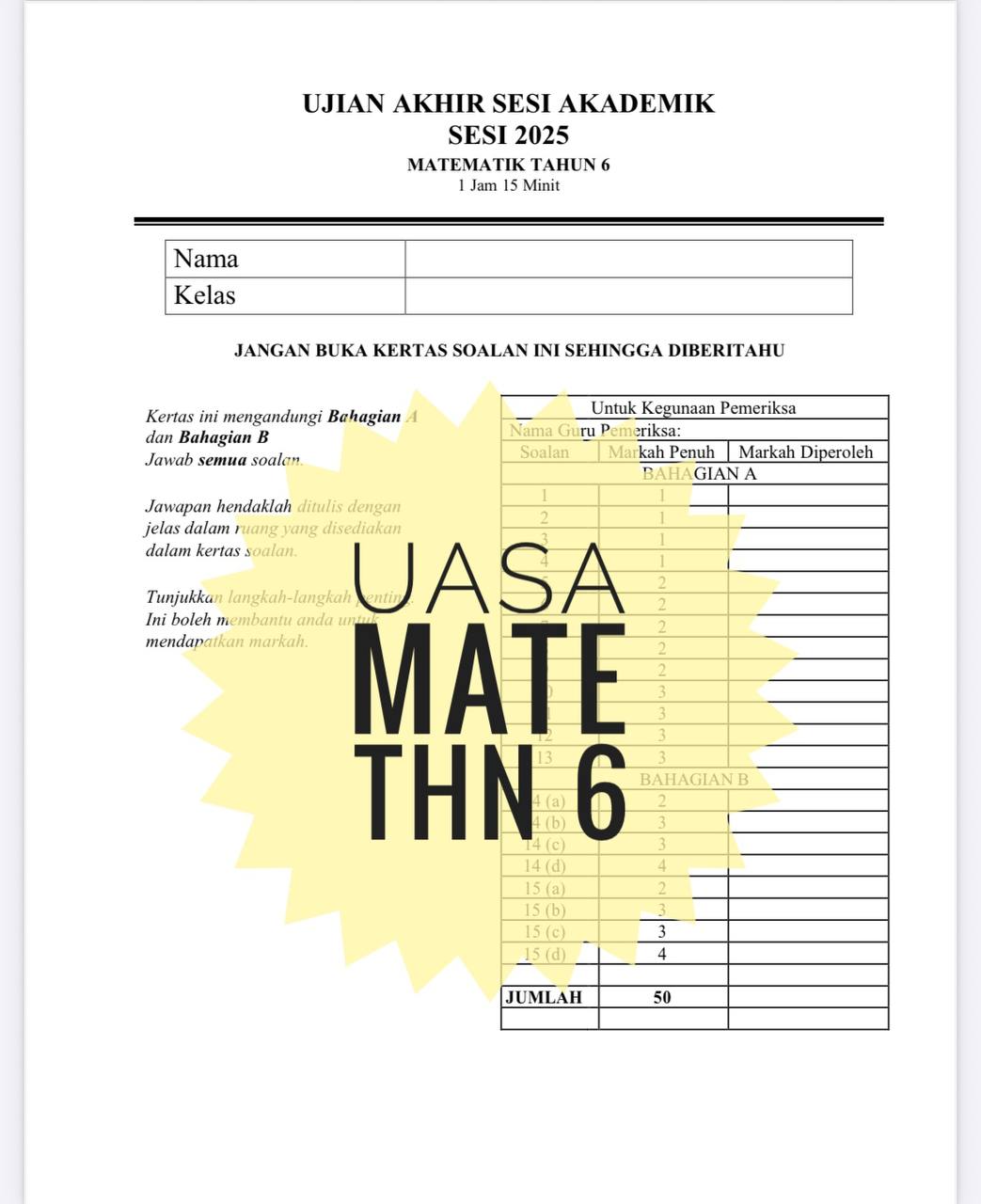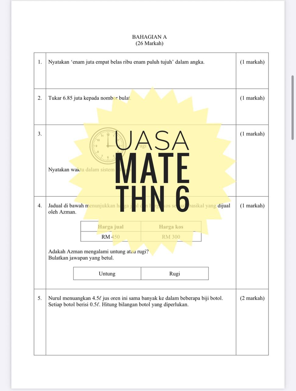 UASA MATEMATIK TAHUN 6 (1 set soalan)