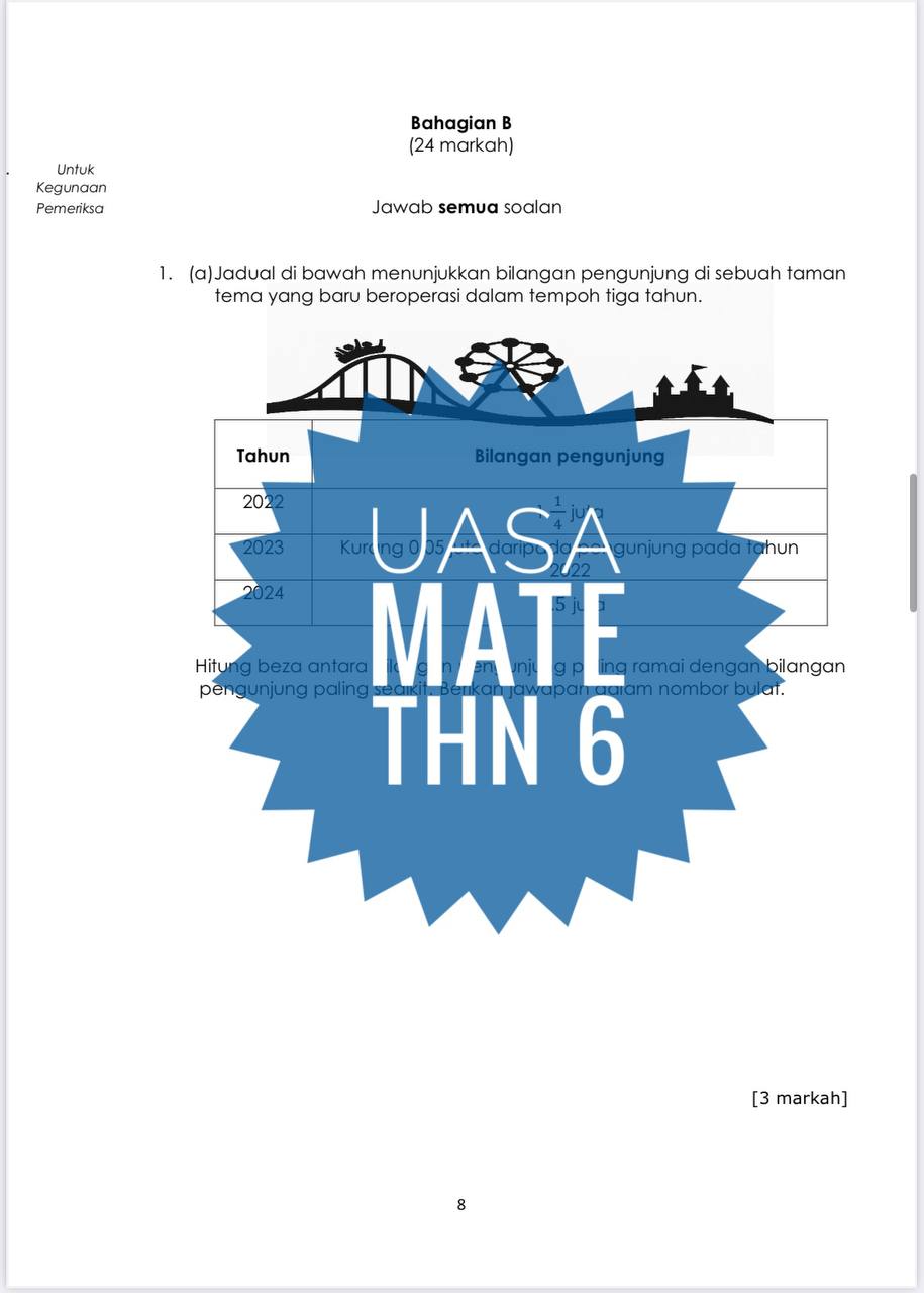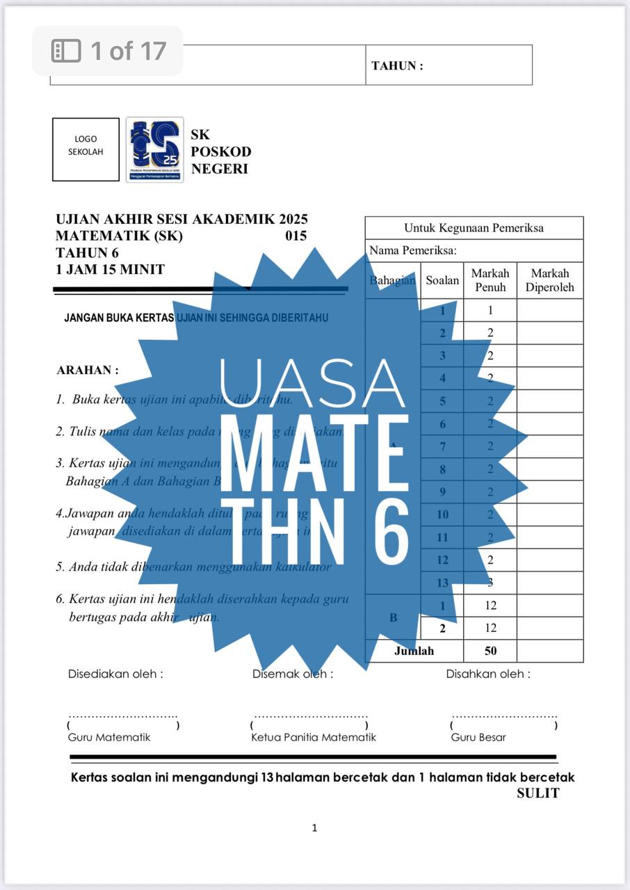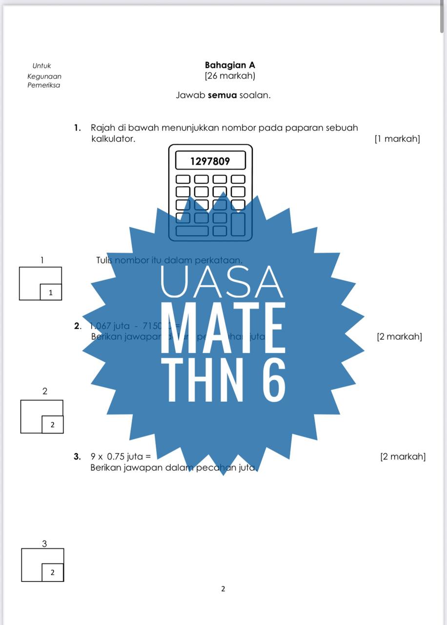 Whatsapp 011-5668 0954 jika ada masalah email tidak diterima. Sila sertakan bersama bukti bayaran atau order. UASA – Matematik Tahun 6 2025/2026 (Set 2A-JSU+JSI)
