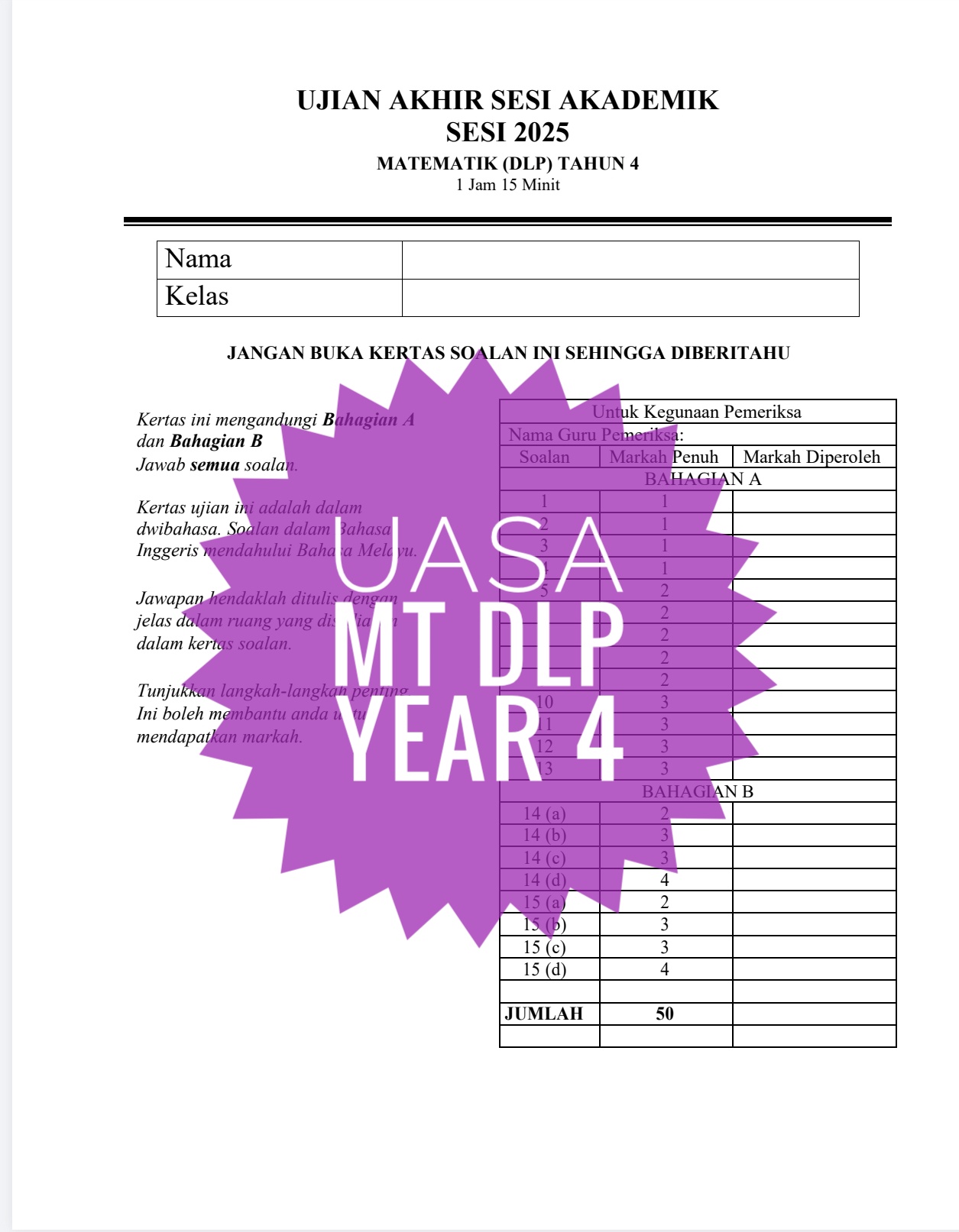 Whatsapp 011-5668 0954 jika ada masalah email tidak diterima. Sila sertakan bersama bukti bayaran atau order. UASA – Mathematics DLP Tahun 4 2025/2026 (Set 1B)