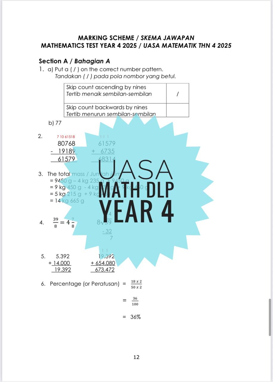 Whatsapp 011-5668 0954 jika ada masalah email tidak diterima. Sila sertakan bersama bukti bayaran atau order. UASA – Mathematics DLP Tahun 4 2025/2026 (Set 2B-JSU)