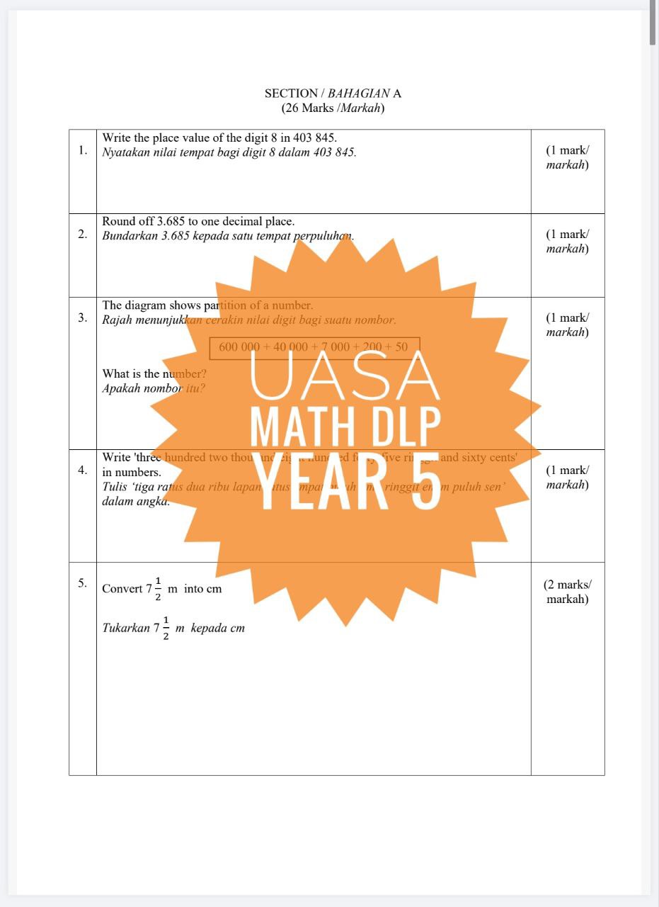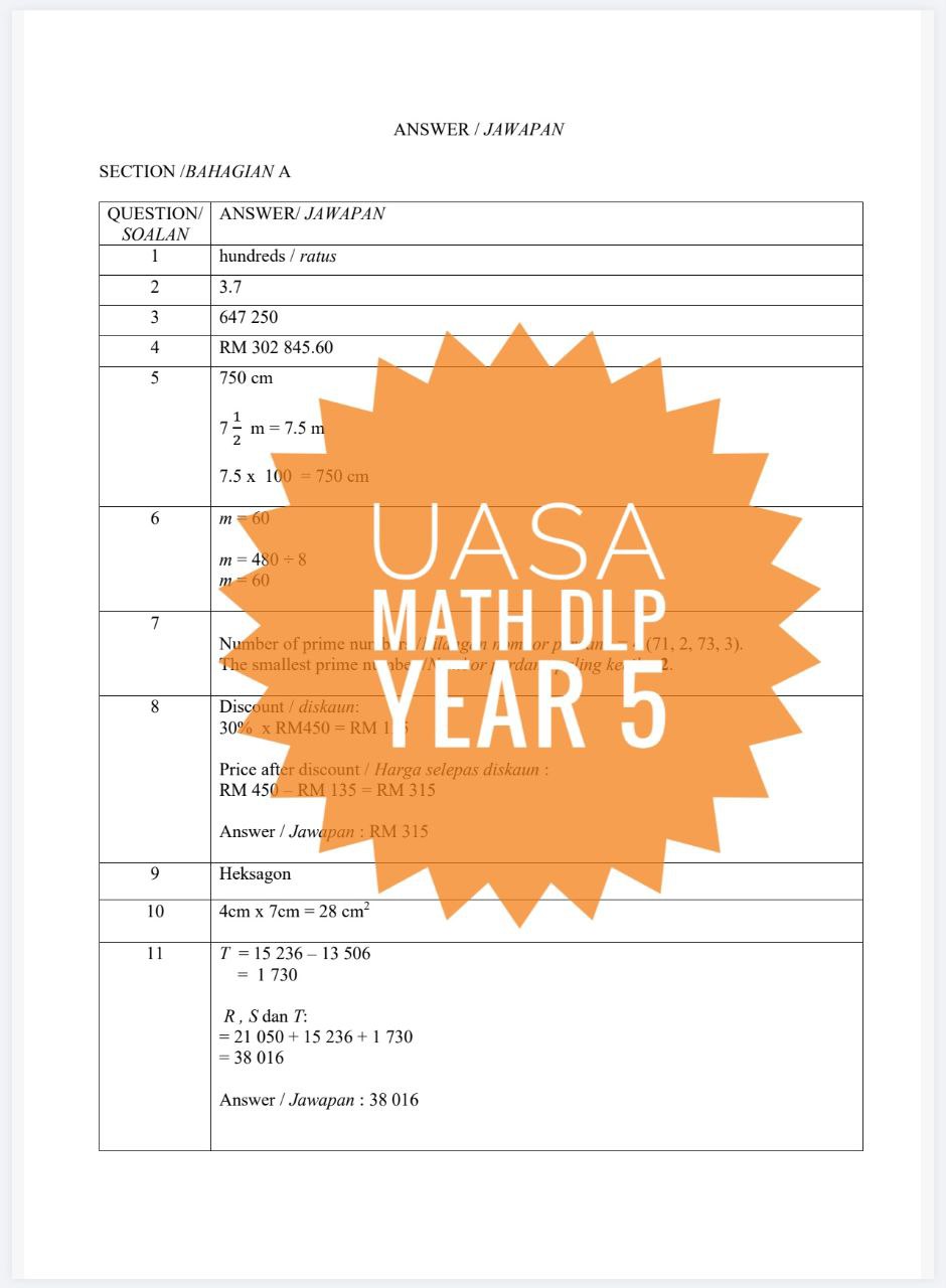 UASA Mathematics DLP Year 5 (1 set soalan)