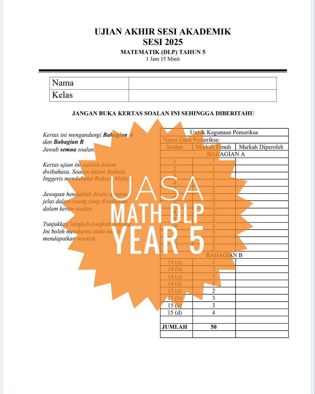 Whatsapp 011-5668 0954 jika ada masalah email tidak diterima. Sila sertakan bersama bukti bayaran atau order. UASA – Mathematics DLP Tahun 5 2025/2026 (Set 1B)