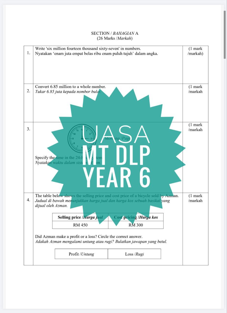 UASA Mathematics DLP Year 6 (1 set soalan)