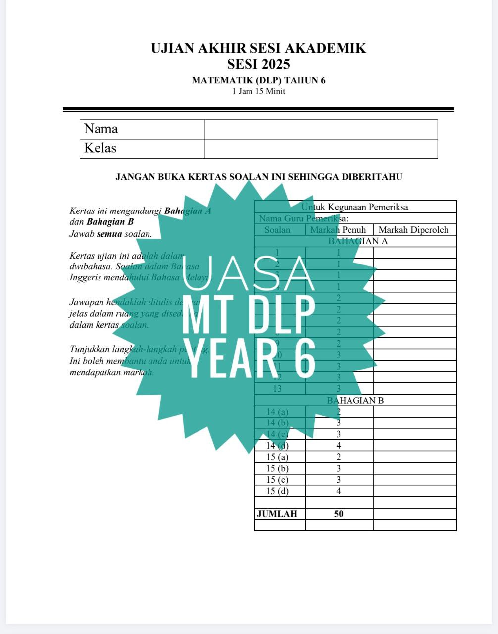 Whatsapp 011-5668 0954 jika ada masalah email tidak diterima. Sila sertakan bersama bukti bayaran atau order. UASA – Mathematics DLP Tahun 6 2025/2026 (Set 1A-JSU)