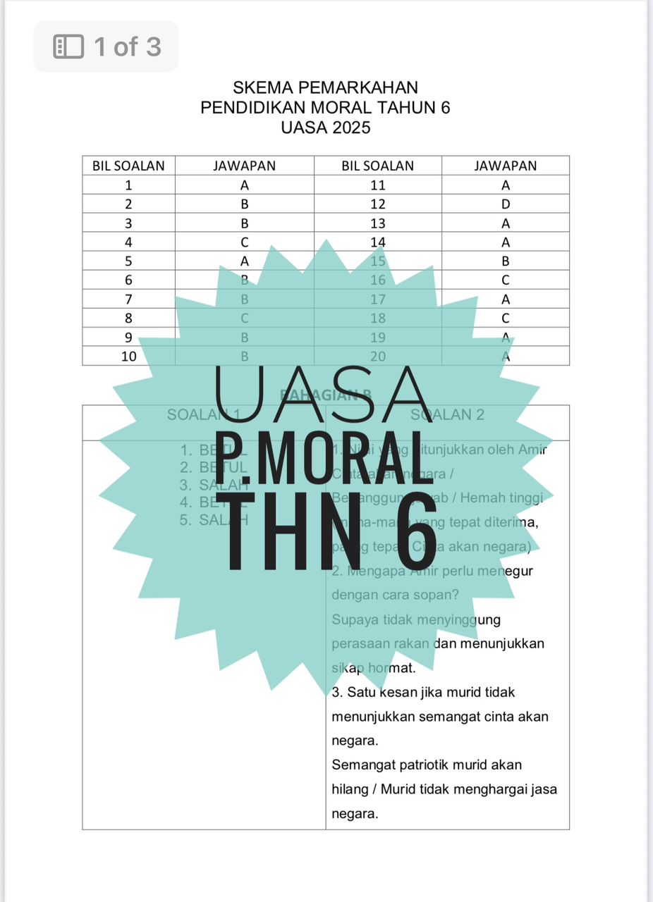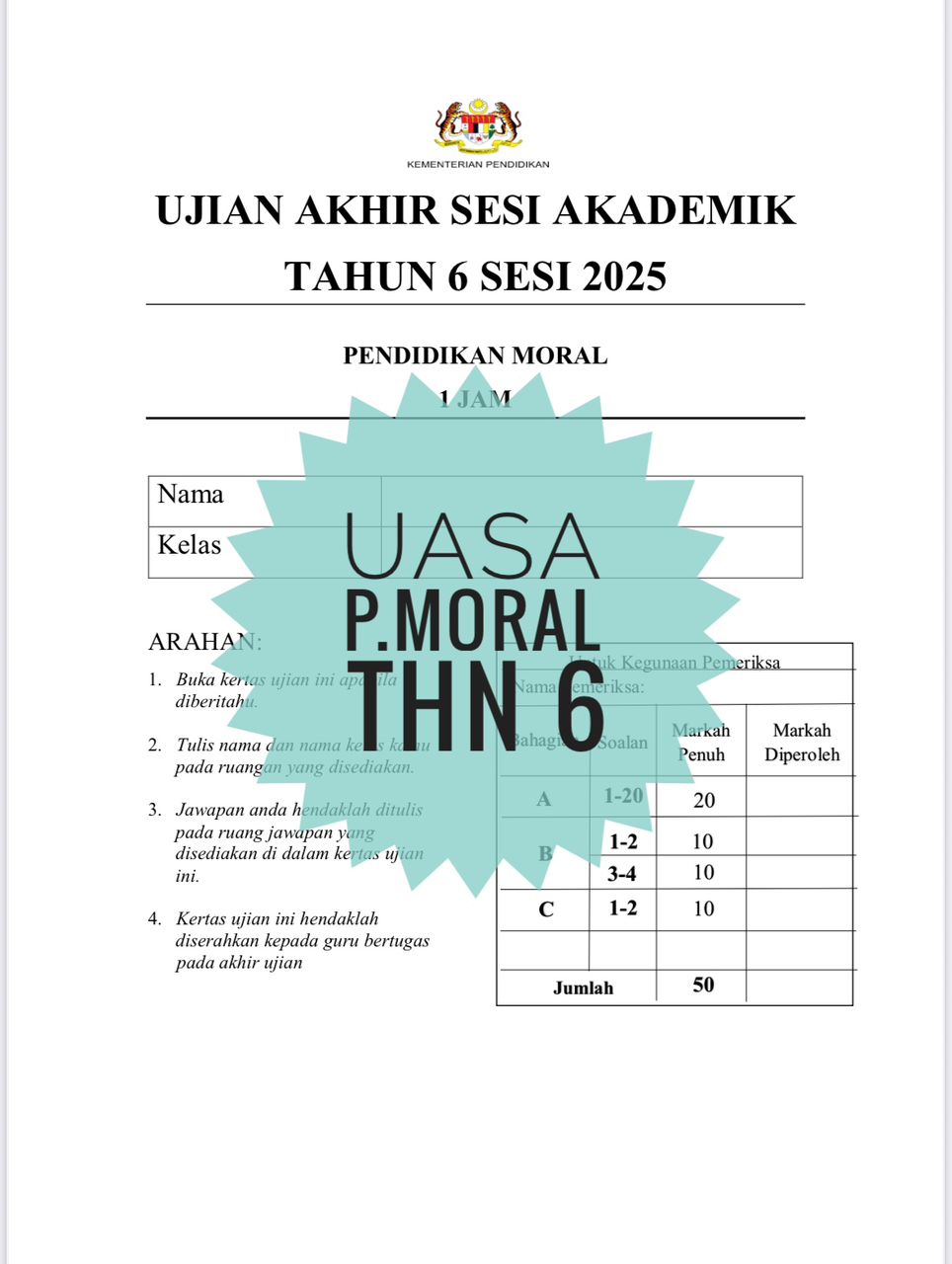 Whatsapp 011-5668 0954 jika ada masalah email tidak diterima. Sila sertakan bersama bukti bayaran atau order. UASA – Pendidikan Moral Tahun 6 2025/2026 (Set 1A – JSU)