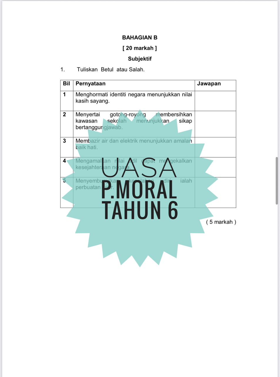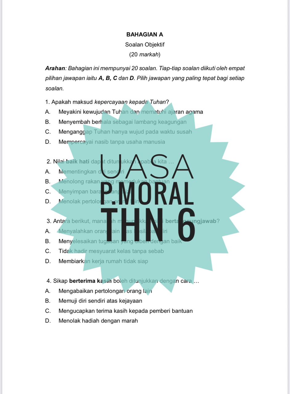 PENDIDIKAN MORAL UASA TAHUN 6 ( 1 set soalan)