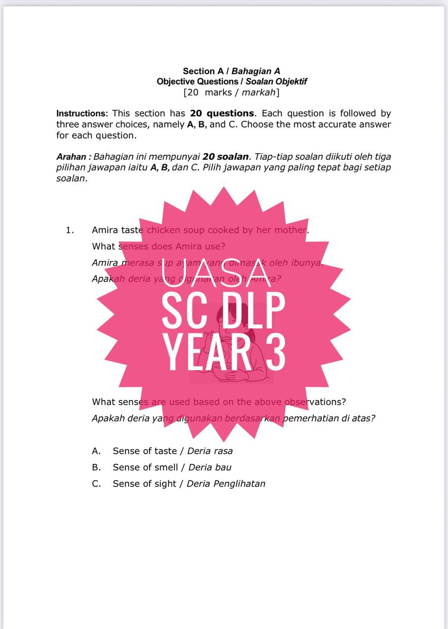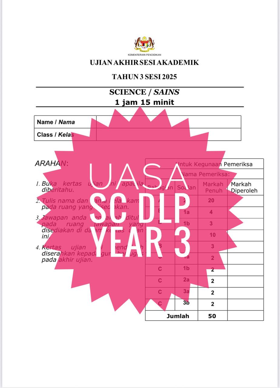 Whatsapp 011-5668 0954 jika ada masalah email tidak diterima. Sila sertakan bersama bukti bayaran atau order. UASA SCIENCE DLP YEAR 3 (1 set soalan)