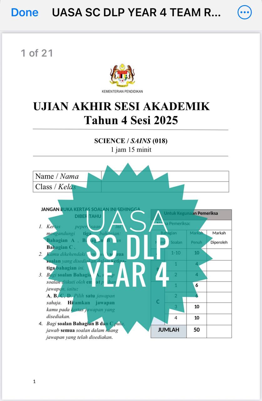 Whatsapp 011-5668 0954 jika ada masalah email tidak diterima. Sila sertakan bersama bukti bayaran atau order. UASA SCIENCE DLP YEAR 4 (1 set soalan)