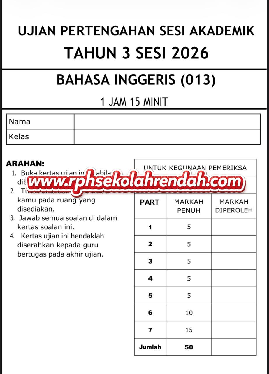 BAHASA INGGERIS UPSA TAHUN 3 ( 1 set soalan)