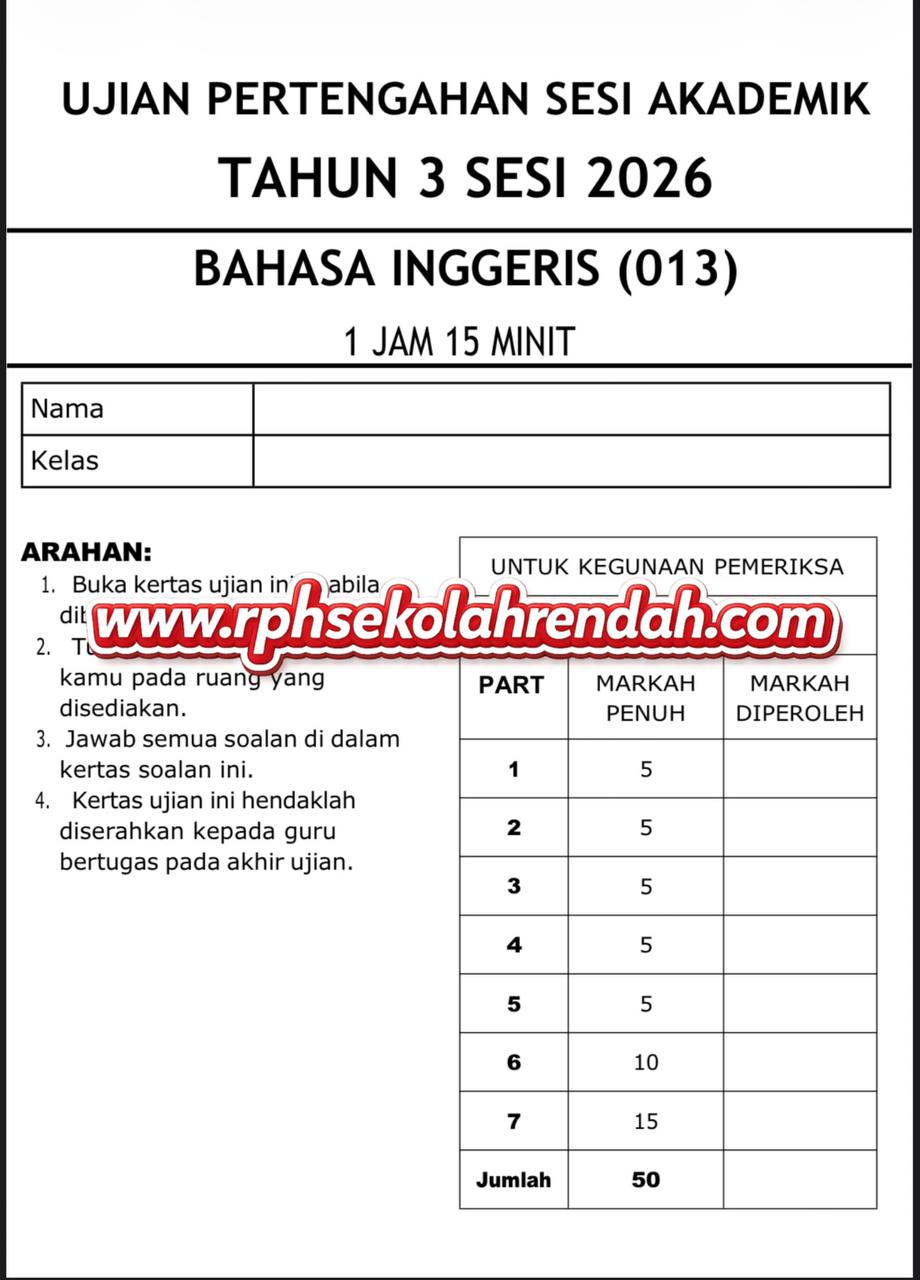 UPSA – Bahasa Inggeris Tahun 3 2026 (Set 2 – Soalan Sahaja)