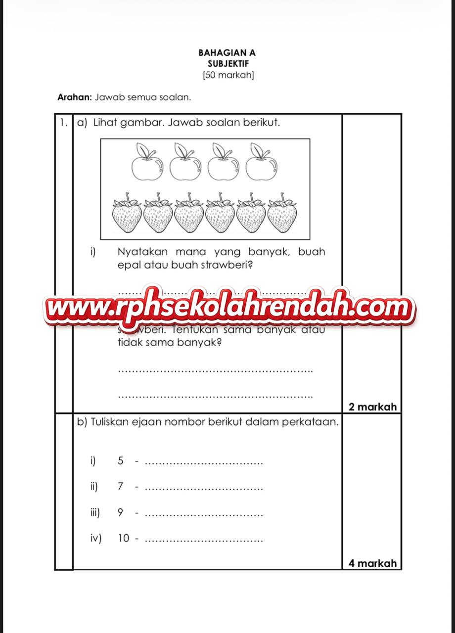 MATEMATIK UPSA TAHUN 1 ( 1 set soalan)