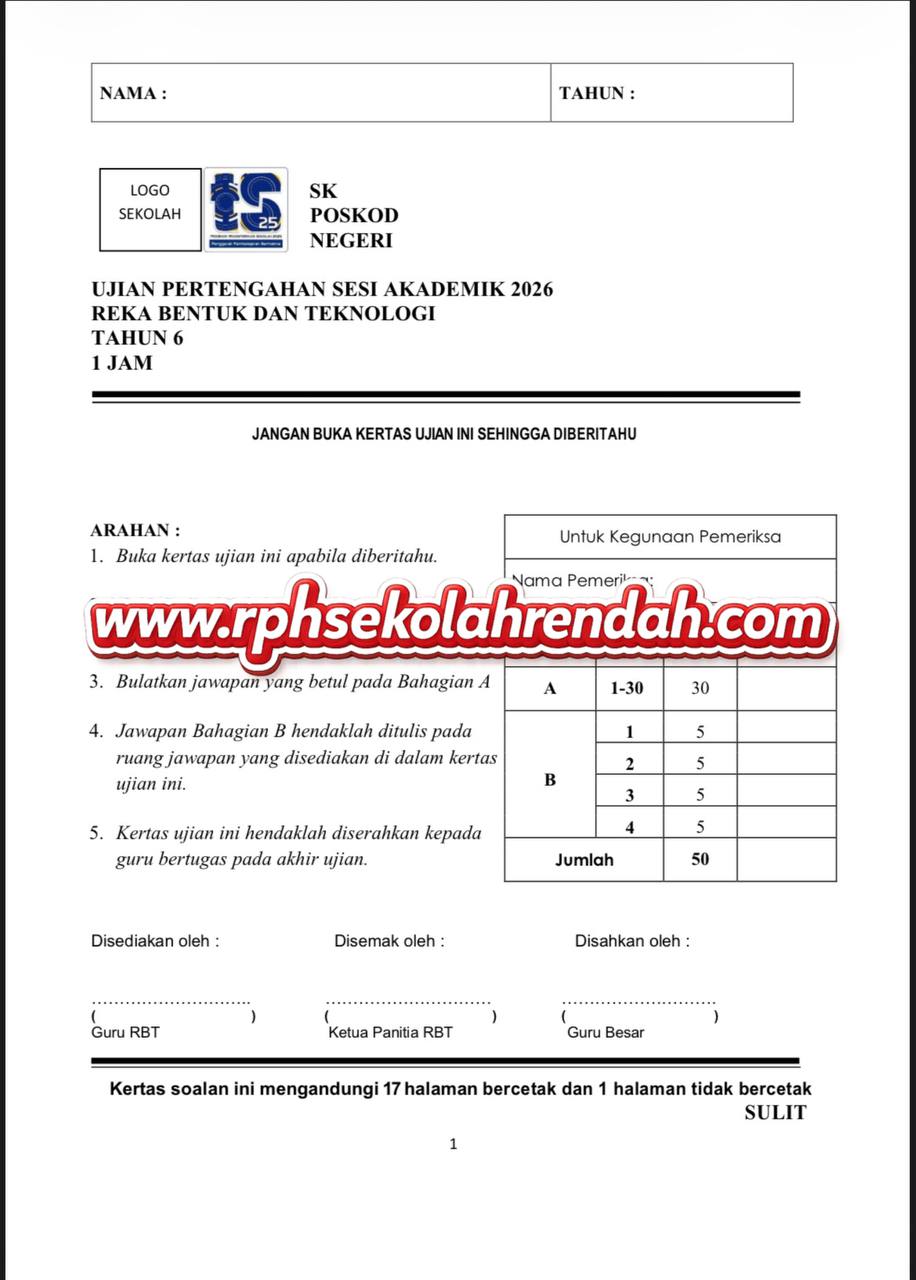 UPSA – RBT Tahun 6 2026 (Set 1- Soalan Sahaja)